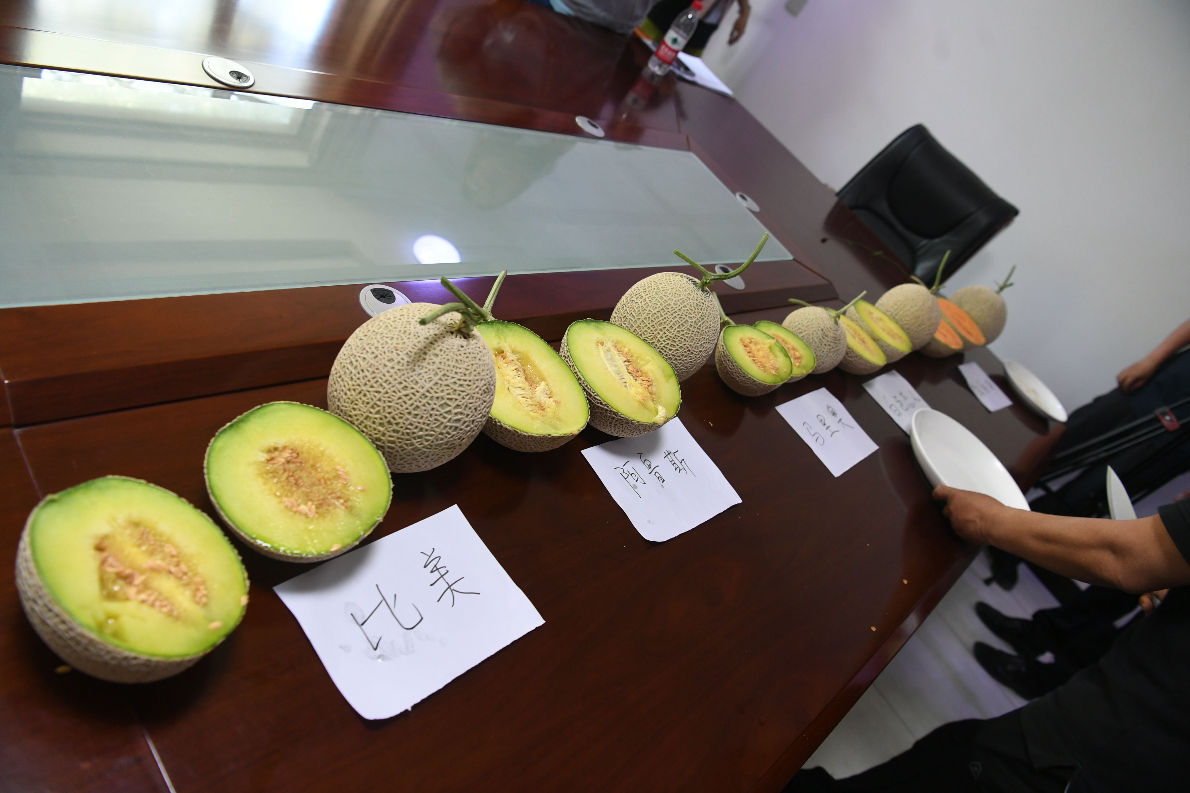 专家在给网纹甜瓜做糖度检测。新京报记者 王颖 摄