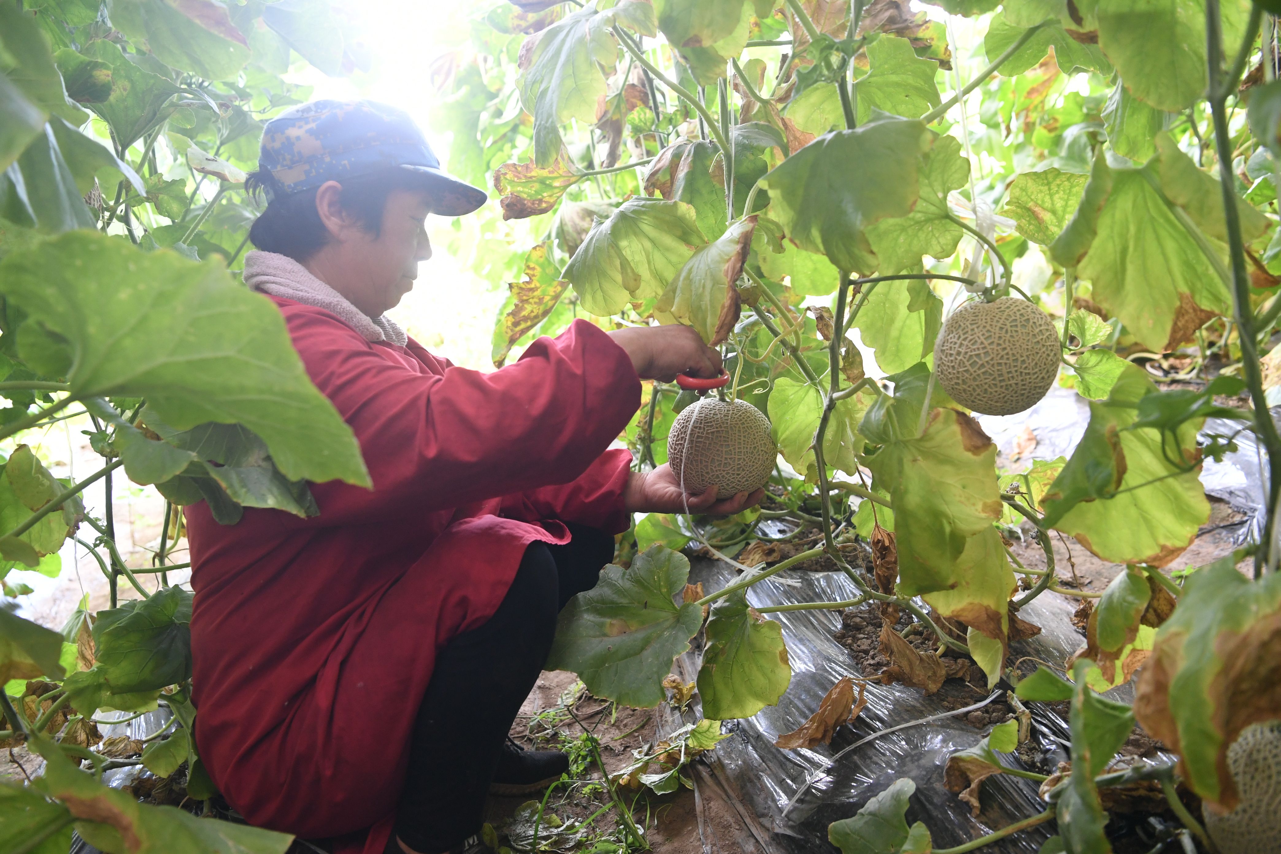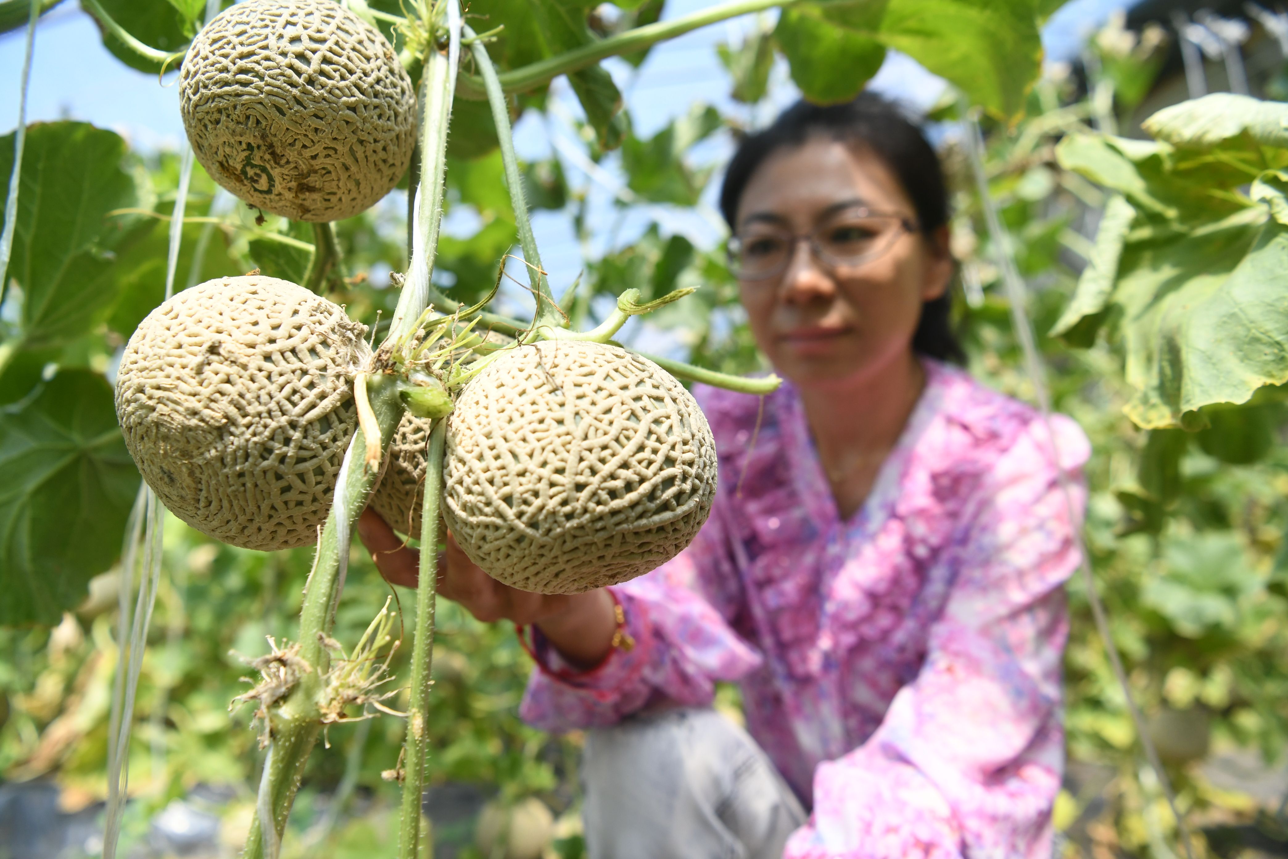 北京市农业技术推广站专家,正在查看网纹甜瓜长势。新京报记者 王颖 摄