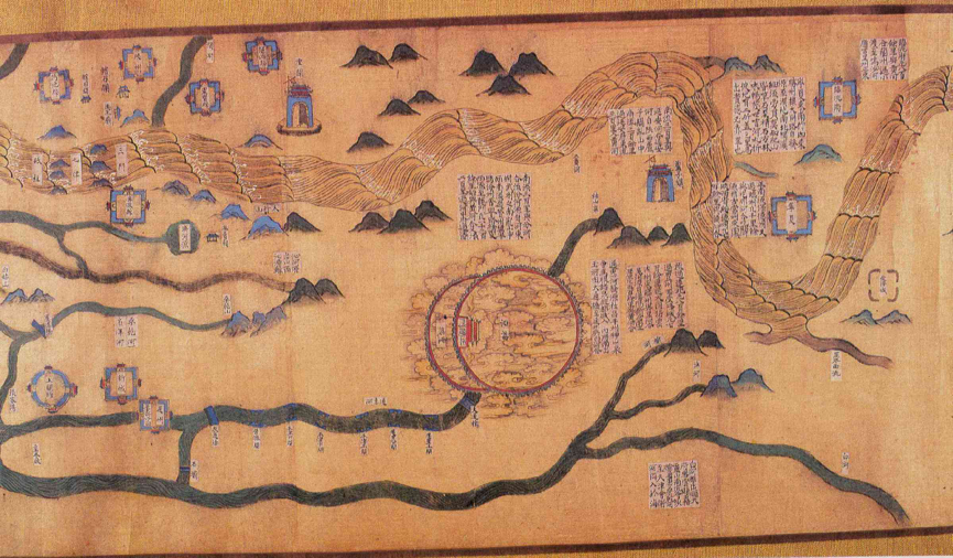 《大明混一图》是一幅明洪武年间彩绘绢本地图,现存于中国第一历史档案馆。作为一幅明王朝及其邻近地区全图,地图所绘地理范围东起日本,西达西欧,南括爪哇,北至蒙古。全图没有明显的疆域界线,仅以地名方框的不同颜色区别内外所属。根据图上“广元县”“龙州”两处地名标注推断,此图绘制于明洪武二十二年(1389)。地图着重描述了明王朝各级治所、山脉、河流的相对位置,标注镇寨堡驿、渠塘堰井、湖泊泽池、边地岛屿及古遗址、古河道等共计数千余处。这些标注原先为汉字,在清康熙年间被覆以大小不一的满文标签。全图水道纵横,除黄河外,均以灰绿色曲线标识。标出名称的河流达百余条,针对较大河流还另外标明源流。图中顺天府被两条大河环抱,东北侧为北运河,西南侧为永定河,两河最终汇入海河,向东入海。