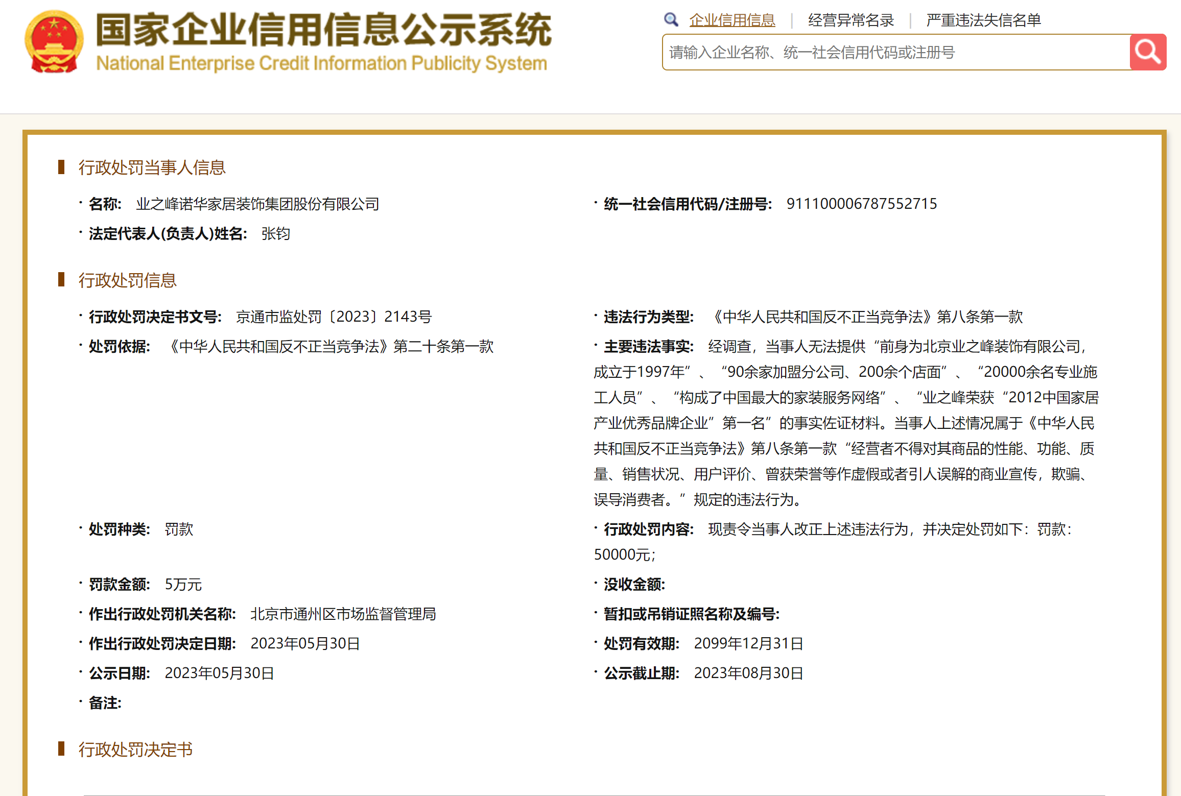 新京报讯(记者张洁)6月5日,新京报记者从国家企业信用信息公示系统获悉,业之峰诺华家居装饰集团股份有限公司因违反反不正当竞争法相关条款,被北京市通州区市场监督管理局罚款5万元。