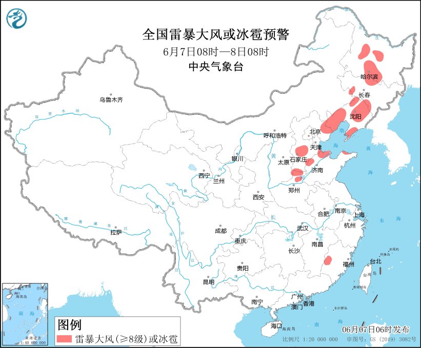 预计6月7日8时至8日8时,黑龙江中南部、吉林中部、辽宁中北部和西部、河北中南部和东北部、山东北部、河南北部、福建西部等地的部分地区将有8-10级雷暴大风或冰雹天气;吉林东部、辽宁东部、安徽南部、江苏南部、上海、湖北南部、湖南东北部和南部、江西中北部和西南部、浙江、福建北部、四川南部、贵州中西部和东北部、云南西部和东北部、广西东部和南部、广东中西部、海南岛中西部和东北部等地的部分地区将有短时强降水天气,小时雨量20-50毫米,局地可达60毫米以上。