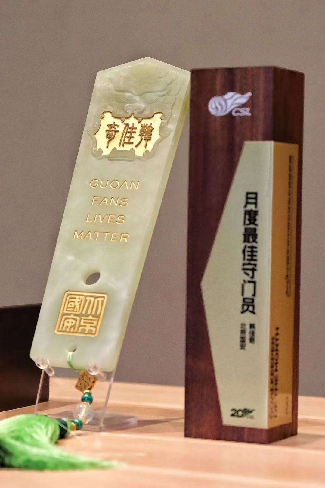 6月6日下午,北京国安俱乐部向韩佳奇颁发4月和5月最佳球员奖杯,俱乐部时隔3年再度重启月度最佳球员评选。为了让球员能更直观地感受到这一奖项的意义,俱乐部文化积淀中有更多中国元素,设计团队历时3个半月设计制作出了目前这款具有古韵国风的玉质奖杯。