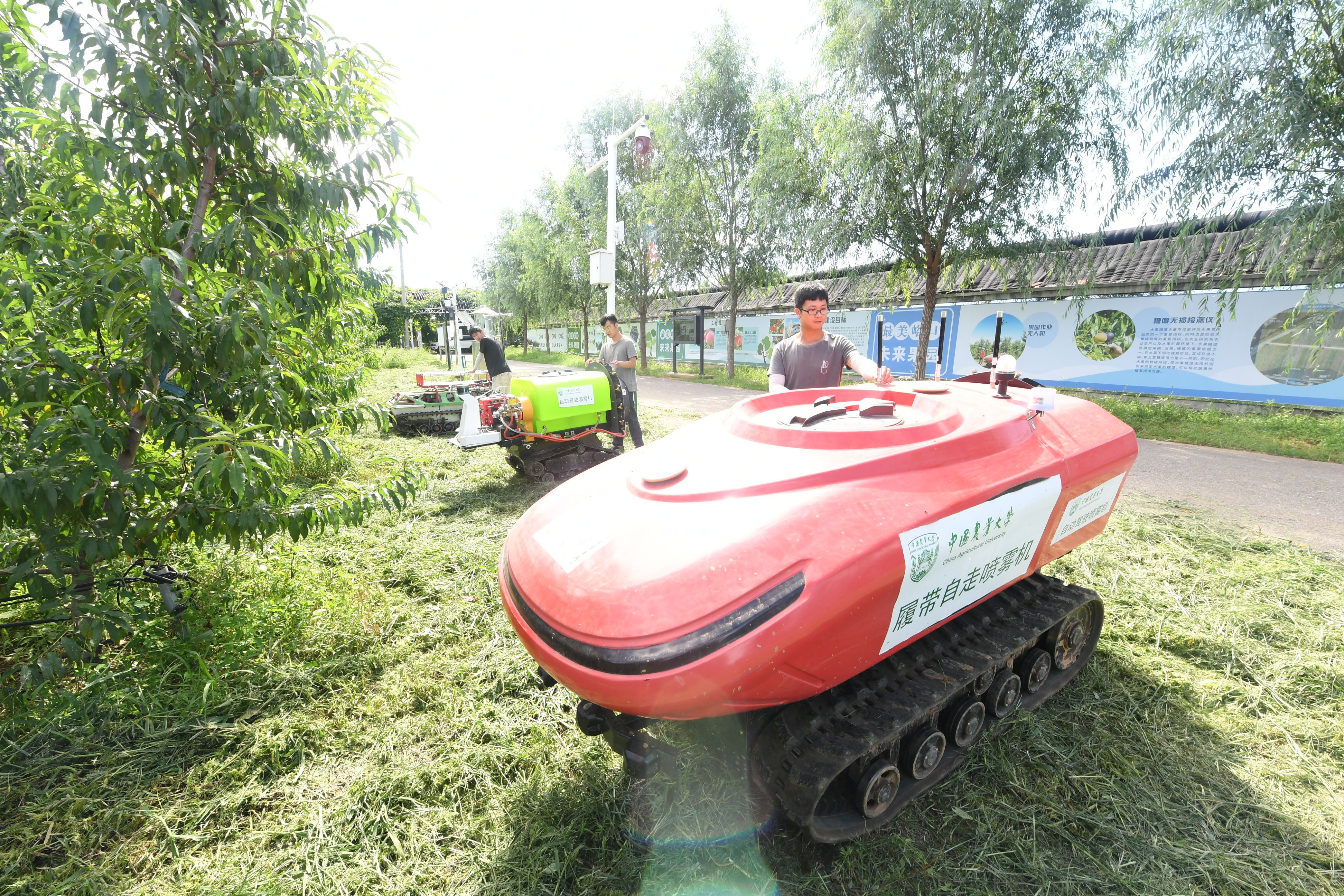 在”未来果园“,中国农业大学学生正在检修自动驾驶喷雾设备。受访者供图