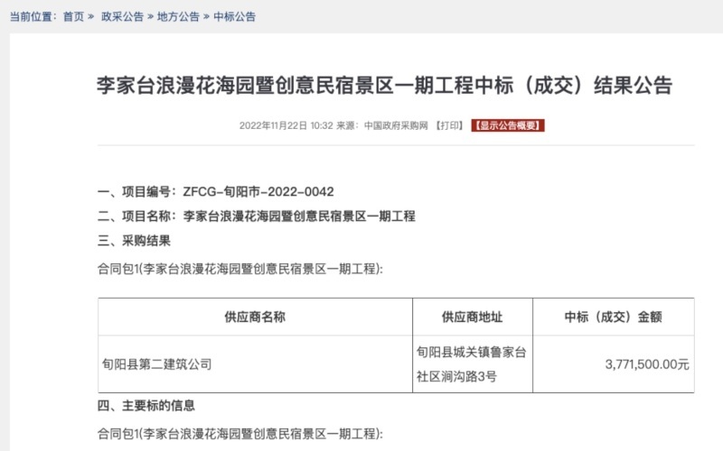 ▲涉事民宿景区一期工程中标(成交)结果公告。图/城关镇人民政府官网截图