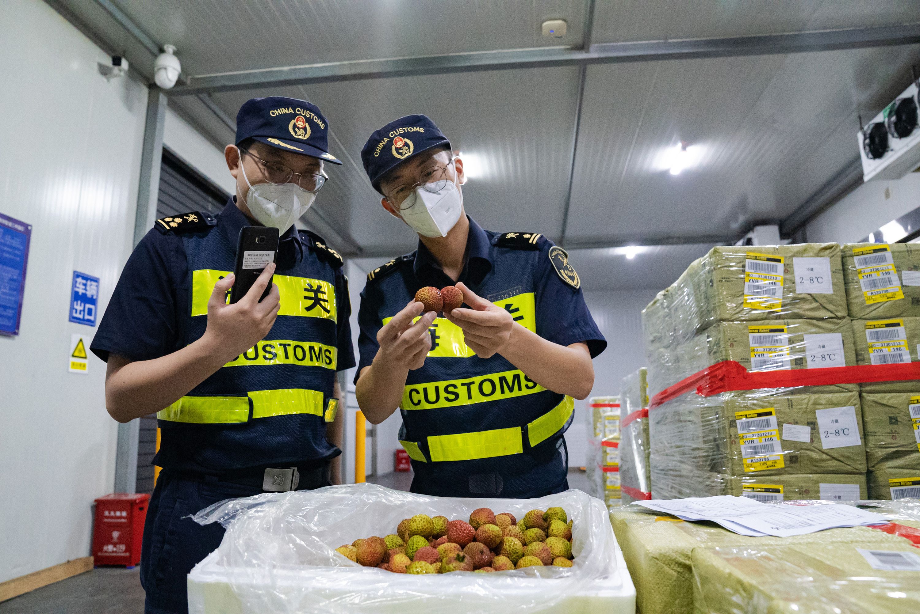 近期,深圳机场口岸也迎来本地荔枝出口旺季。为保障荔枝顺畅通关,深圳宝安国际机场海关提前对接企业出口需求,在航线选择、舱单运输、货物申报上提供一对一指导。针对荔枝低温保鲜的特殊通关要求,海关开通荔枝出口绿色通道,支持“冷链车-冷库-温控舱”全程冷链运输,并安排优先查验,实现极速通关全程保鲜,确保出口荔枝产品质量。