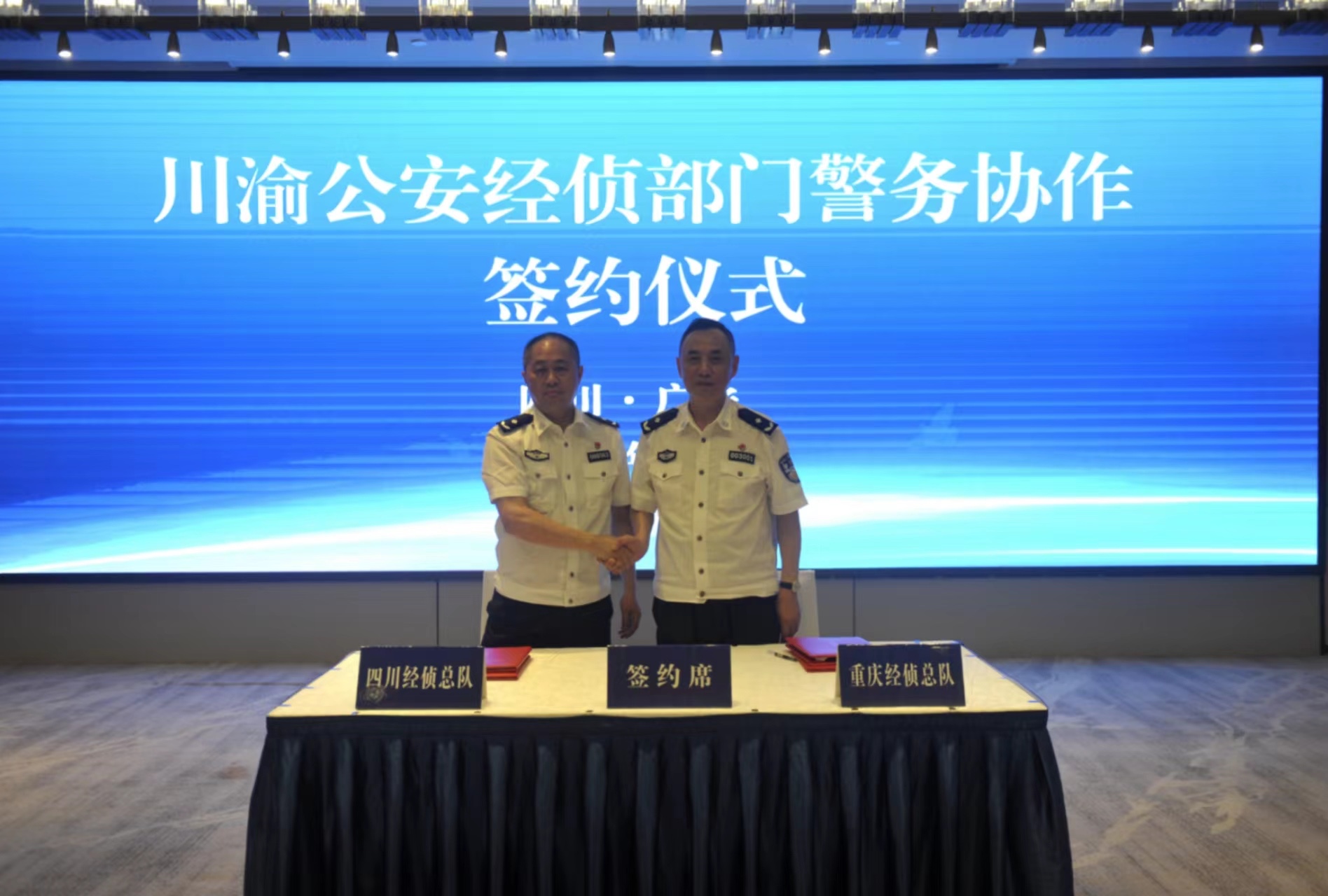 签约仪式现场。图源:重庆警方会上,围绕常态协作、资源共享、互利共赢工作原则,川渝两地经侦总队签订了《川渝公安经侦部门素质强警交流合作协议》《川渝公安经侦部门数据赋能合作协议》,进一步构建优势互补、资源共享、协调发展、整体提升的交流合作新格局,进一步加强在数据赋能、人才培养等方面的合作。重庆市公安局渝北区分局经侦支队、四川省广安市公安局经侦支队签订了《服务成渝地区双城经济圈建设一体化协作机制》。