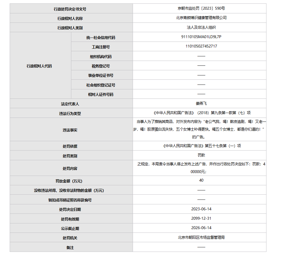 6月14日,北京市市场监督管理局在其官网公示了对北京青颜博识健康管理有限公司的处罚决定。处罚决定书显示,当事人为了推销其商品,对外发布内容为“老公气我,喝!熬夜追剧,喝!又老一岁,喝!胶原蛋白流失快,五个女博士补得更快。喝五个女博士,都是你们逼的!”的广告,北京市朝阳区市场监督管理局责令当事人停止发布上述广告,并处罚款40万元。