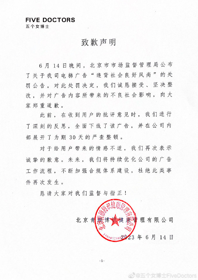 新京报讯 6月14日晚,“五个女博士”在其官博就电梯广告“违背社会良好风尚”被处罚一事发布致歉声明,称诚恳接受、坚决整改。以下为声明全文: