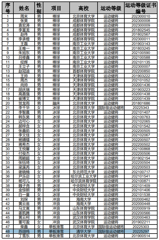 新京报讯 6月15日,国家体育总局科教司发布关于2023年优秀运动员本科保送推荐名单的公示,公示时间为2023年6月15日至21日。共有820名运动员通过审核,获得保送上大学的推荐资格。其中,北京冬奥会冠军、单板滑雪运动员苏翊鸣保送推荐清华大学。
