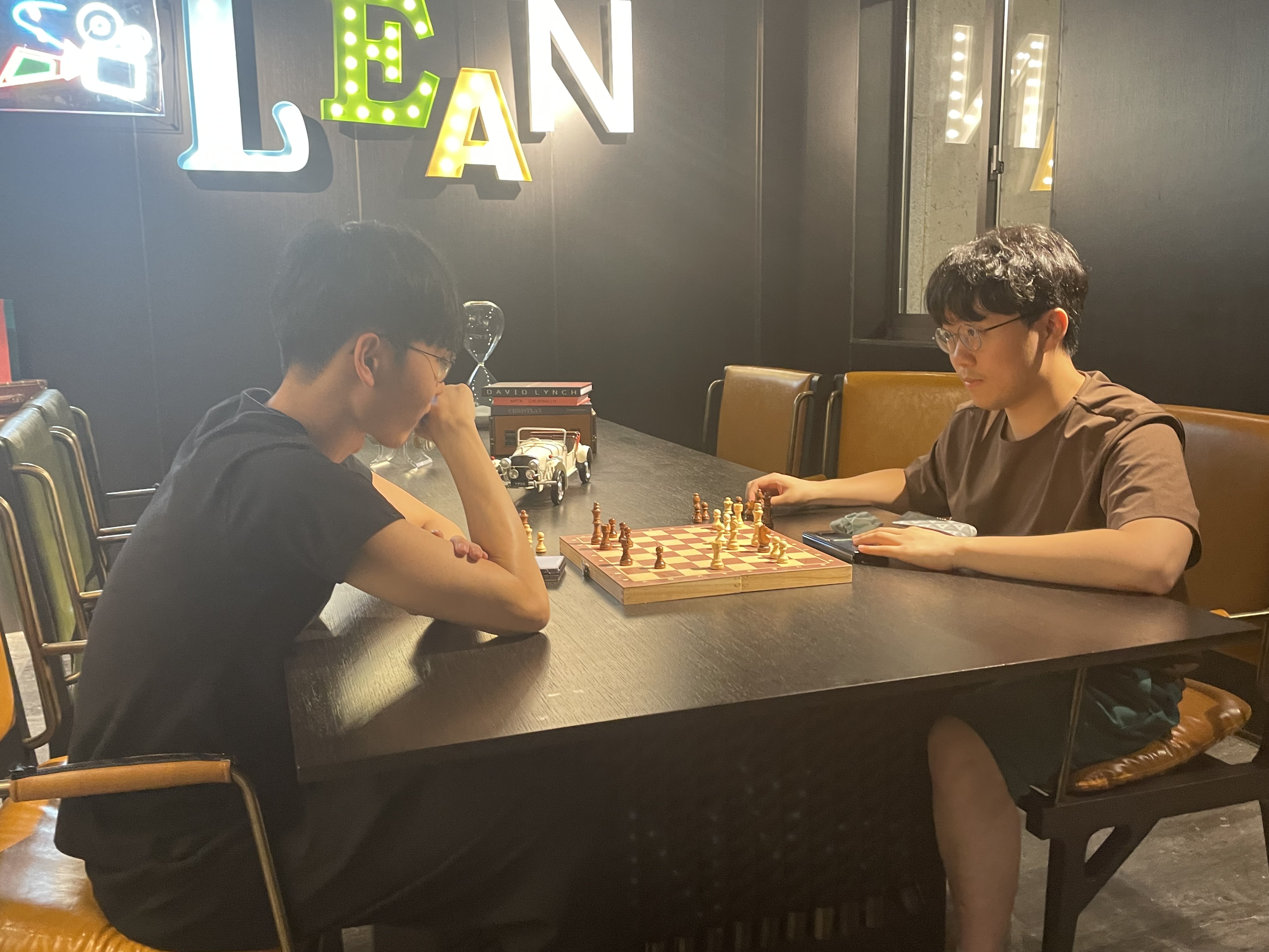 申旻俊(右)和申真谞一起下国际象棋放松。 新京报记者 孙海光 摄