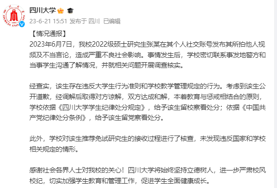 据@新华社消息,四川大学发布情况通报:2023年6月7日,我校2022级硕士研究生张某在其个人社交账号发布其所拍他人视频及不当言论,造成严重不良社会影响。事情发生后,学校密切联系事发地警方和当事学生沟通了解情况,并就相关问题开展调查核实。