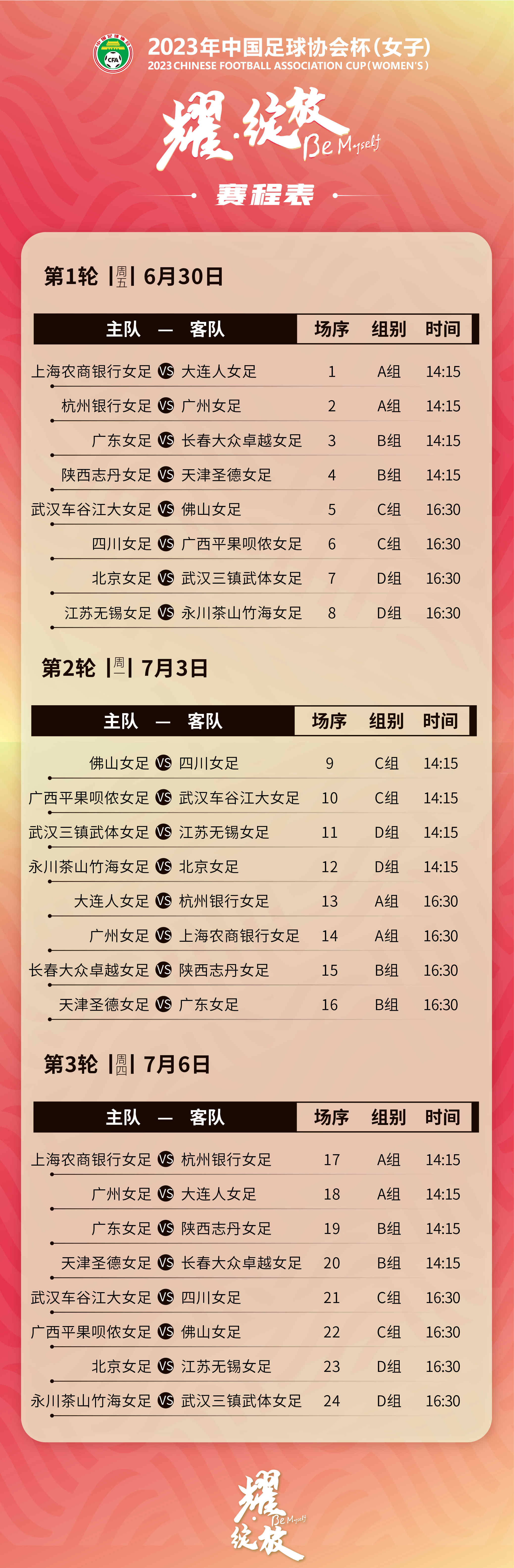 2023女子足协杯小组赛阶段赛程: