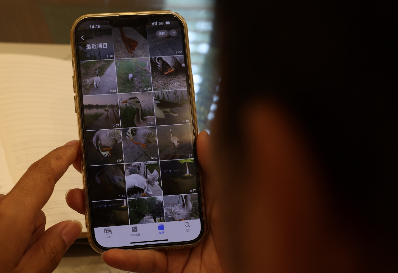 跟“大宝”交情变深之后,郭先生把自己的网络社交账号也改成了“斑头雁大宝”,里面有67条视频,记录了“大宝”的生活点滴。其中有给“大宝”送食物的,也有带它遛圈引游客驻足观望场景,还有“大宝”与赤麻鸭、黑天鹅干仗等场景。