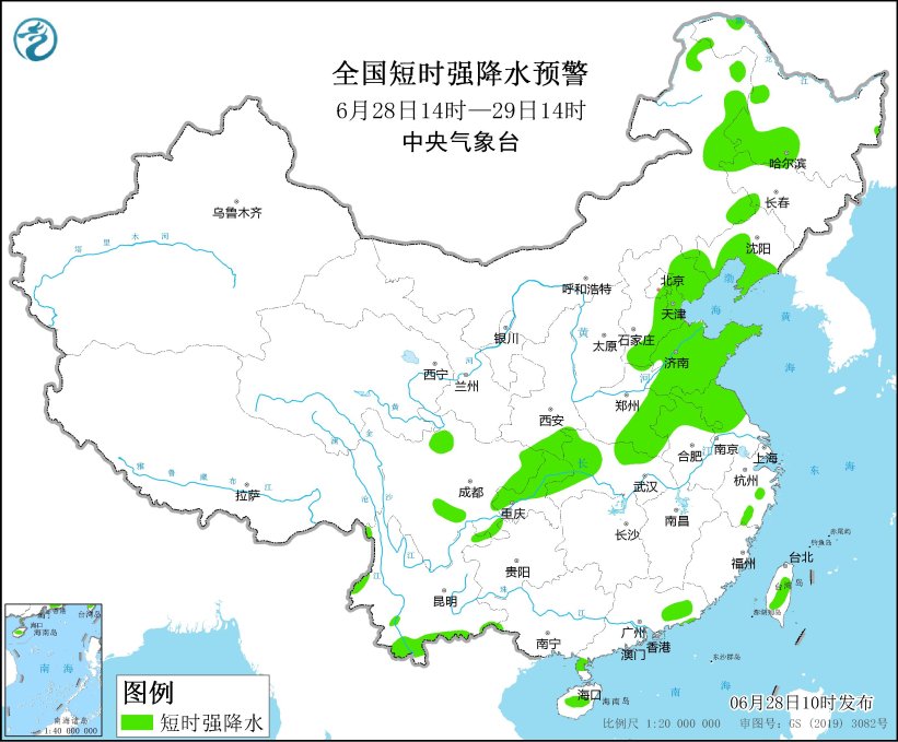 预计6月28日14时至29日14时,内蒙古东北部、吉林中西部、辽宁中西部、河北中东部、北京东北部、天津、山东中东部、安徽北部、江苏中北部、湖北东北部等地的部分地区将有8-10级雷暴大风或冰雹天气,局地风力可达11级,江苏北部、安徽北部、山东东部和南部局地可能伴有龙卷;内蒙古东部、黑龙江西南部、吉林西部、辽宁南部、陕西南部、河北中东部和南部、北京东部、天津、山东、河南东部和南部、安徽北部、江苏中北部、湖北北部和西部、四川盆地东北部、重庆中北部、云南南部、海南岛中部、台湾岛中部等地的部分地区将有短时强降水天气,小时雨量30-50毫米,局地可达70毫米以上。