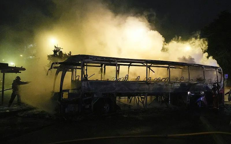 当地时间2023年7月1日凌晨,法国楠泰尔,一辆公共汽车被烧毁,消防员在灭火。图/视觉中国
