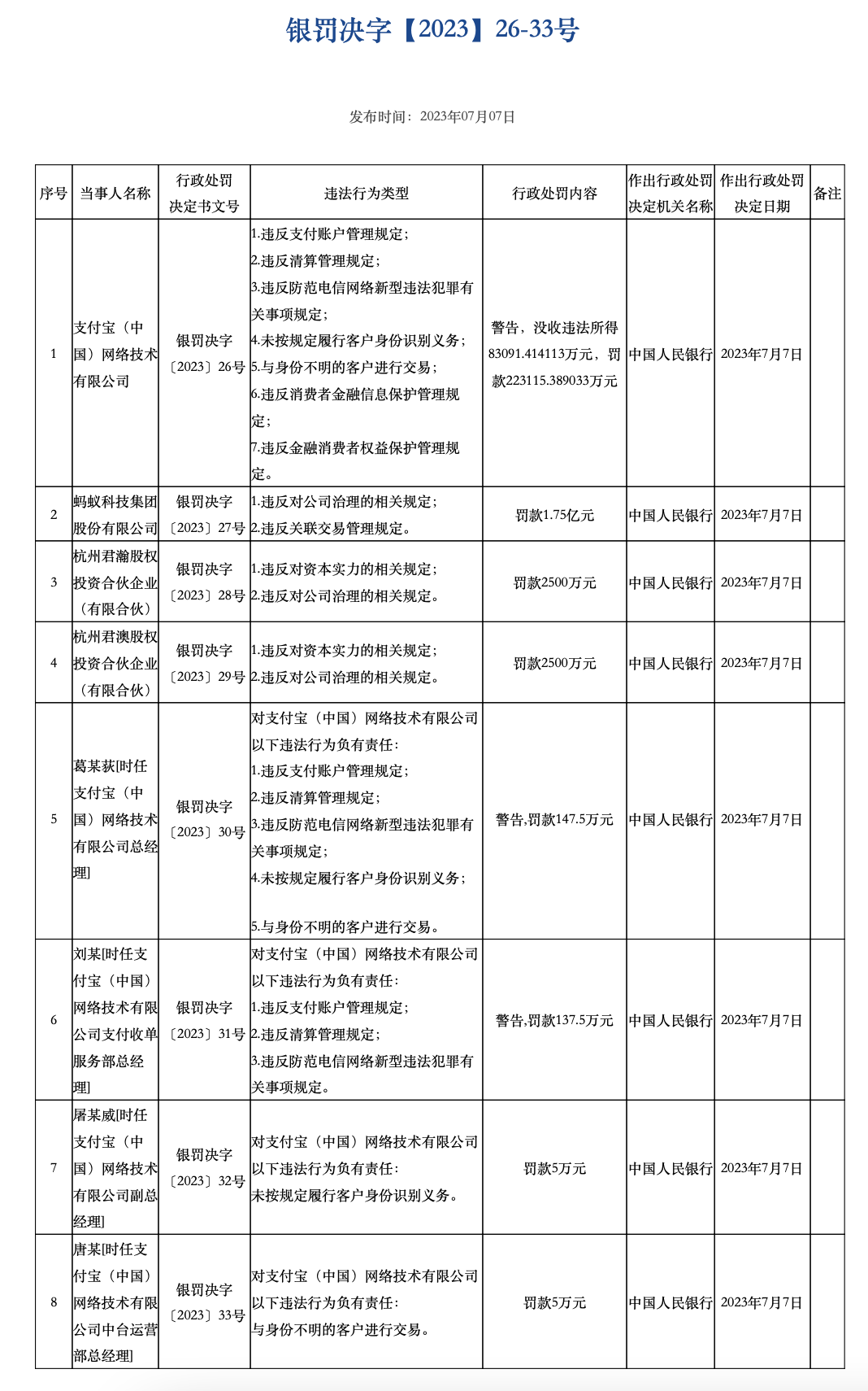 新京报讯 7月7日,中国人民银行发布的行政处罚信息显示,蚂蚁科技集团股份有限公司因违反对公司治理的相关规定、违反关联交易管理规定,被中国人民银行罚款1.75亿元。详情如下: