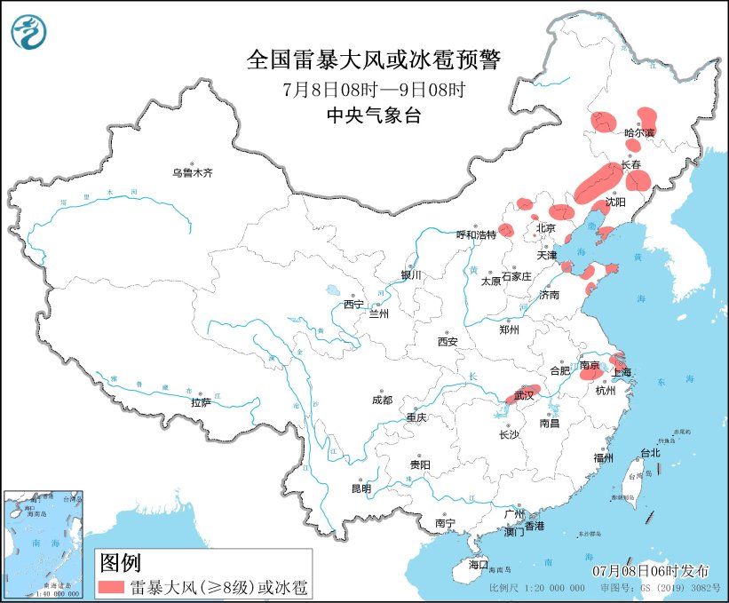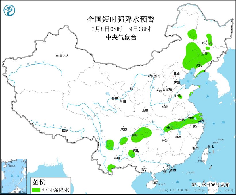 预计7月8日08时至9日08时,内蒙古东南部、黑龙江南部、吉林中西部、辽宁、山西北部、河北北部、北京西北部、山东北部和东部、安徽南部、江苏南部、上海、湖北东部和南部、浙江北部等地的部分地区将有8-10级雷暴大风或冰雹天气,局地风力可达11级;内蒙古东部、黑龙江南部、吉林中南部、辽宁、山东南部、安徽中南部、江苏南部、上海、湖北东部和南部、湖南西北部、浙江北部、四川南部、重庆中东部、贵州西部和北部、云南北部和南部等地的部分地区将有短时强降水天气,小时雨量30-50毫米,局地可达70毫米以上。