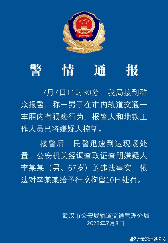 武汉地铁公安:一男子地铁内有猥亵行为被行拘