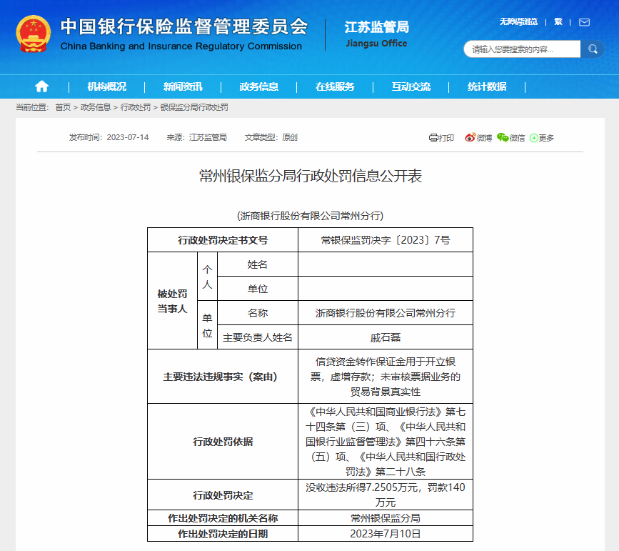 新京报贝壳财经讯 据江苏银保监局7月14日行政处罚信息公开表显示,浙商银行股份有限公司常州分行(下称“浙商银行常州分行”)因存在违法违规行为,被处以140万元罚款,同时被没收违法所得7.2505万元。