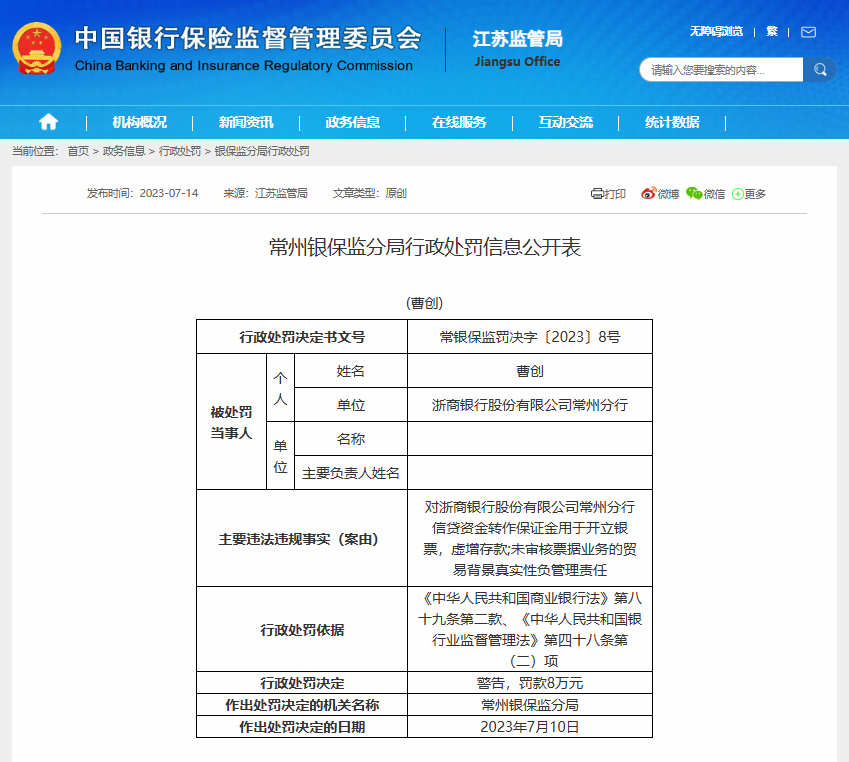 此外,公示表还显示,浙商银行常州分行的曹创,对该分行这两项违规事实负有管理责任。因此曹创个人被警告,同时被罚8万元。