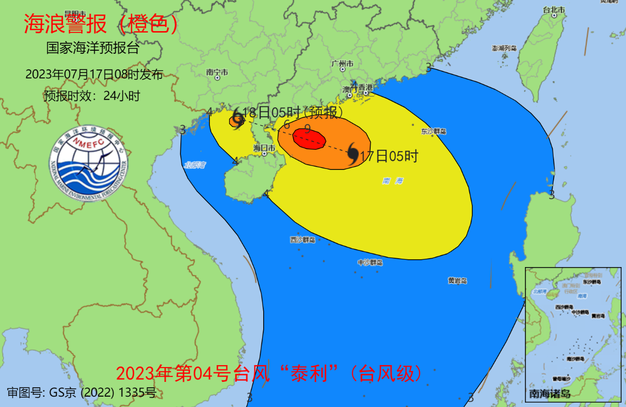 受“泰利”影响,预计7月17日中午到18日中午,南海北部将出现6-9米的狂浪到狂涛区,该近海海域海浪预警级别为橙色;北部湾将出现4-6米的巨浪到狂浪区,该近海海域海浪预警级别为黄色;广东西部近岸海域将出现4-5.8米的巨浪,该近岸海域海浪预警级别为橙色;广西、海南北部近岸海域将出现2.5-4米的大浪到巨浪,该近岸海域海浪预警级别为黄色;广东东部近岸海域将出现2-3米的中浪到大浪,该近岸海域海浪预警级别为蓝色。