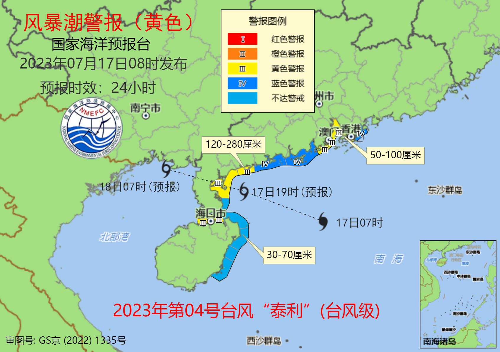 风暴潮方面,预计7月17日上午到18日上午,珠江口沿海将出现50-100厘米的风暴增水;粤西到雷州半岛东岸沿海将出现120-280厘米的风暴增水;海南岛东北部沿海将出现30-70厘米的风暴增水。广东省广州市、中山市、珠海市、茂名市、湛江市和海南省海口市的风暴潮预警级别为黄色,广东省深圳市、江门市和阳江市的风暴潮预警级别为蓝色。