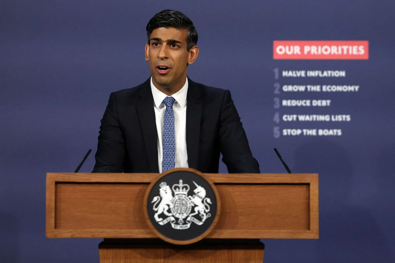 当地时间2023年7月13日,英国伦敦,英国首相苏纳克在唐宁街举行的新闻发布会上就公共部门薪酬问题发表讲话。图/视觉中国