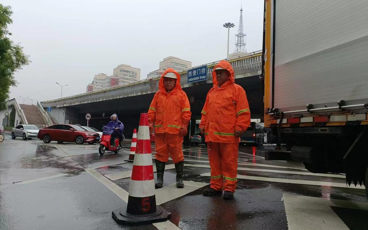 防汛人员在西便门桥值守,保障市民早高峰出行。北京排水集团供图