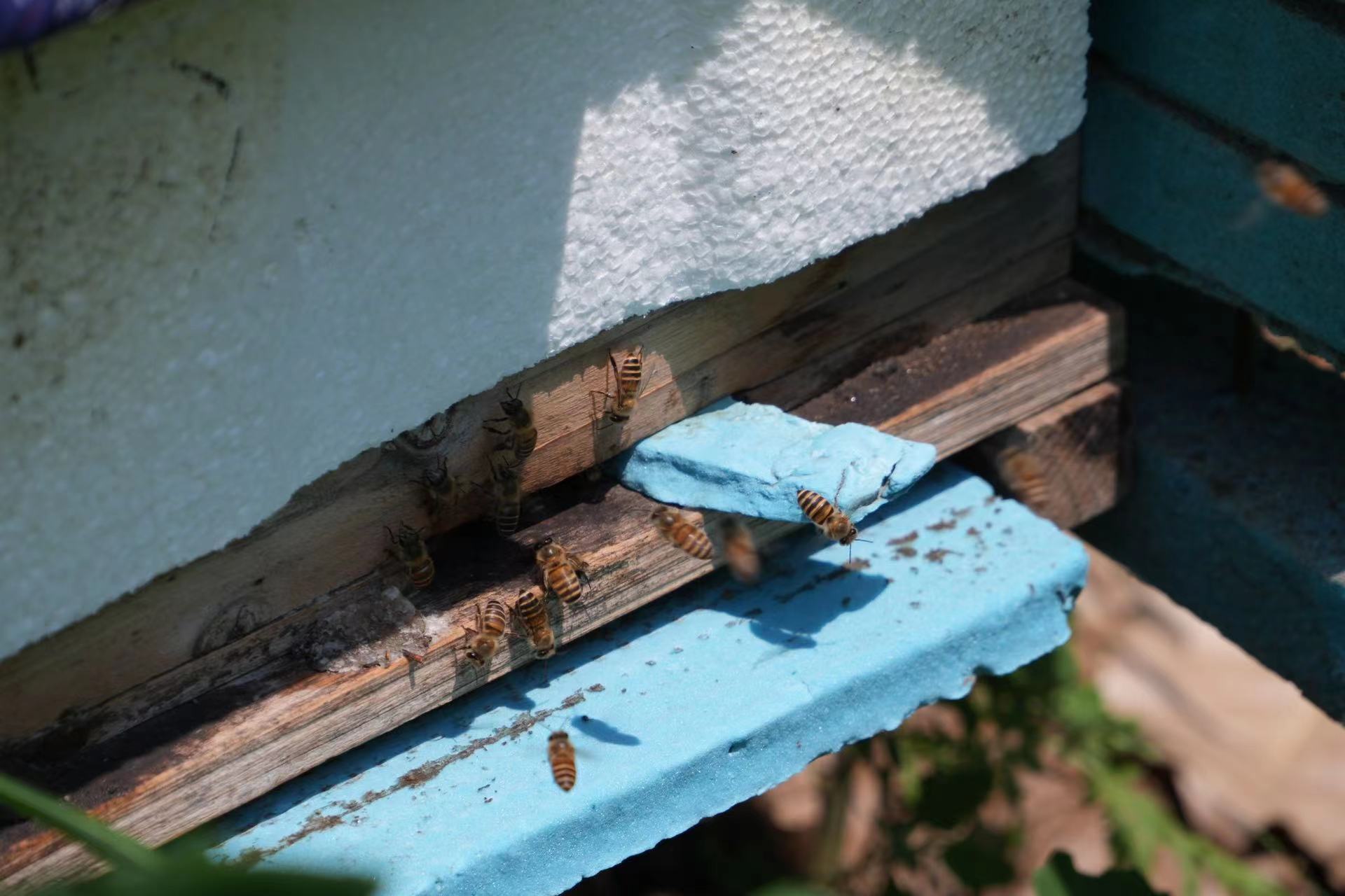 蜜蜂正在进出蜂箱。新京报记者 王巍 摄