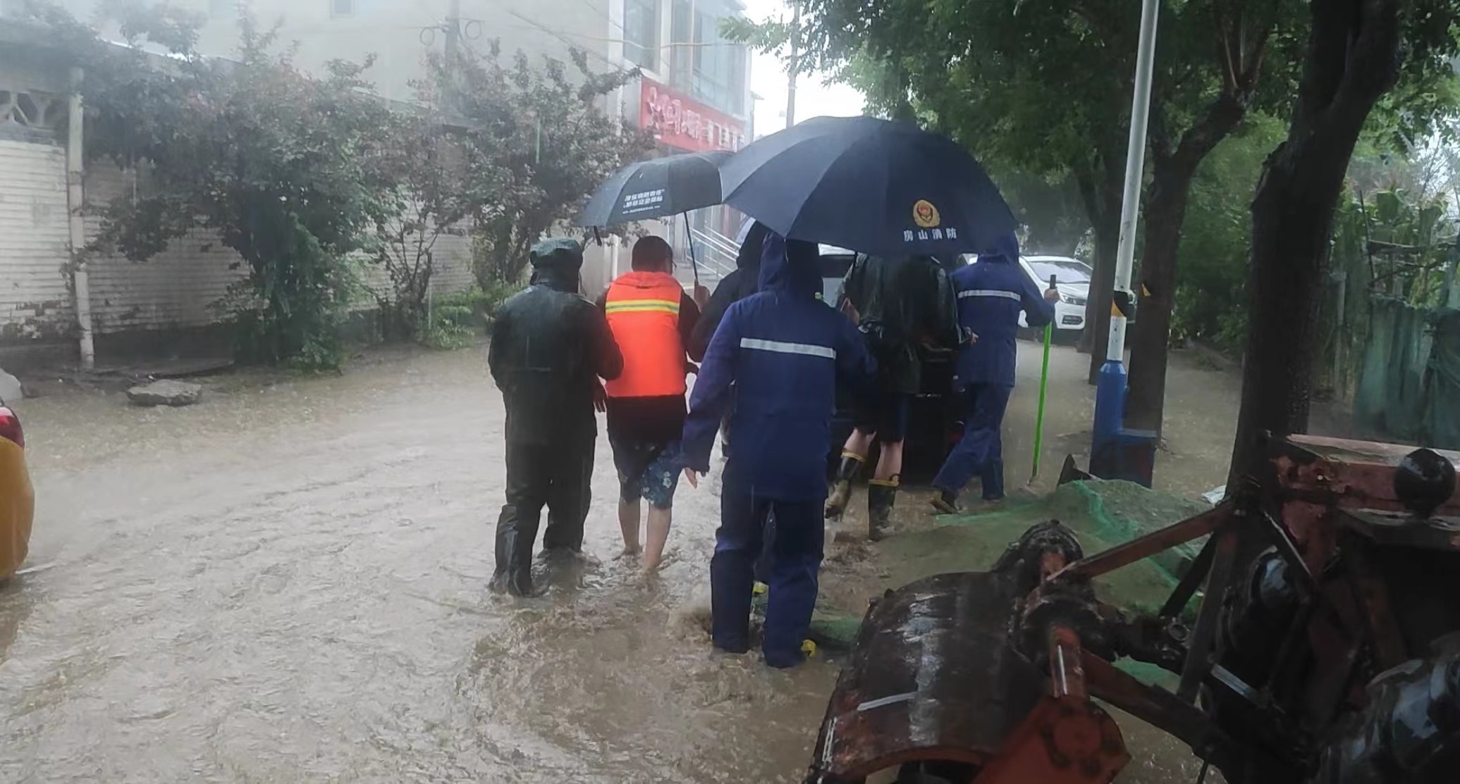 房山区消防救援支队接到车辆涉水警情,将司机转移到安全区域。图源:房山区消防救援支队