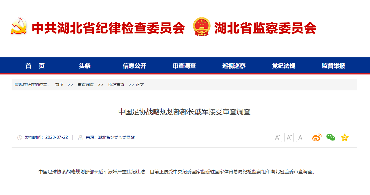 新京报讯 据湖北省纪委监委网站消息,中国足球协会战略规划部部长戚军涉嫌严重违纪违法,目前正接受中央纪委国家监委驻国家体育总局纪检监察组和湖北省监委审查调查。