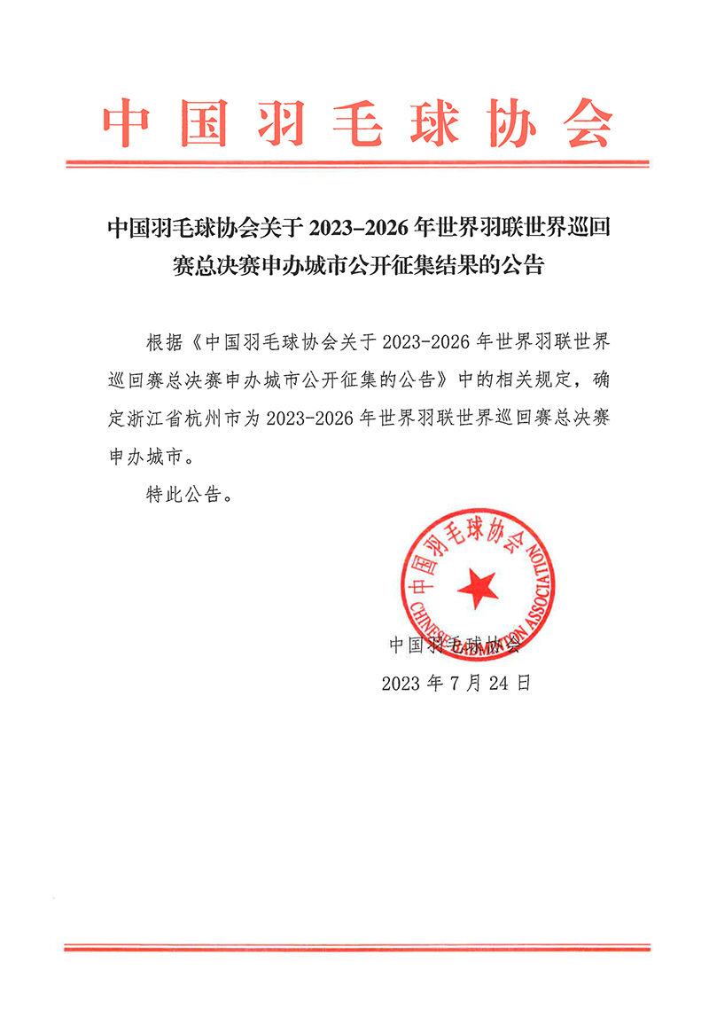 杭州申办2023-2026世界羽联世界巡回赛总决赛