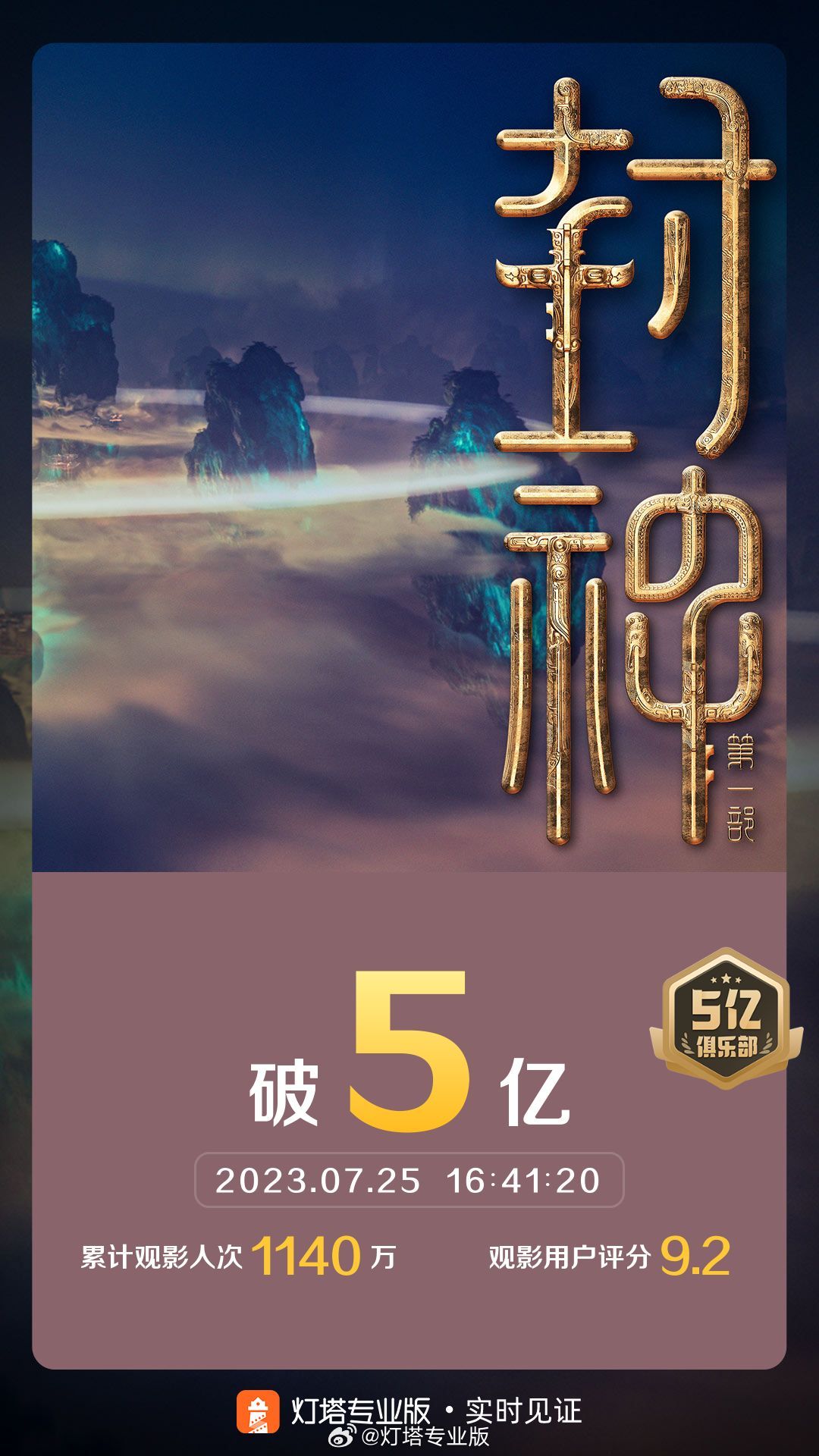 新京报讯 据灯塔专业版数据显示,截至7月25日16时41分,电影《封神第一部》上映6天,票房突破5亿。影片由乌尔善执导,费翔、李雪健、黄渤、于适、陈牧驰、娜然、此沙、武亚凡、夏雨、袁泉、王洛勇、侯雯元、黄曦彦、李昀锐、杨玏、陈坤出演,于7月20日正式上映。