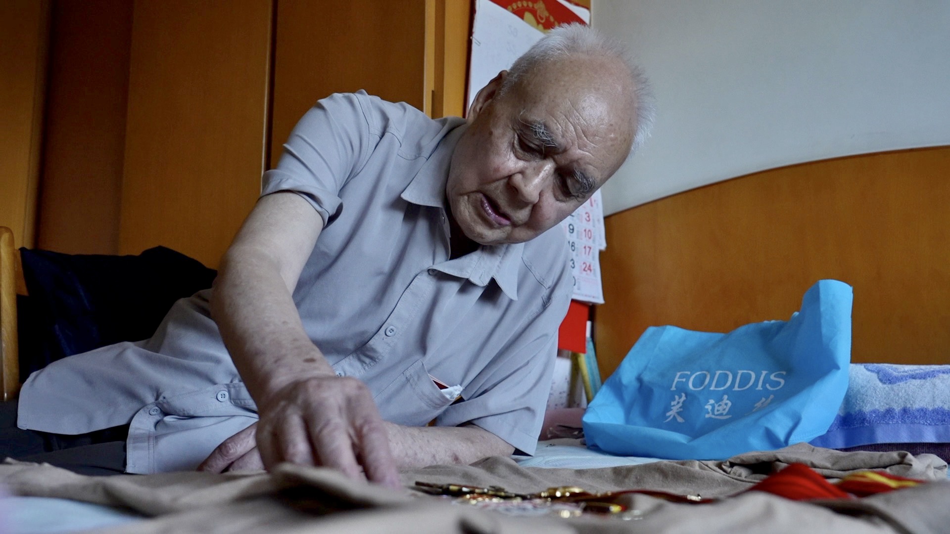 6月29日,四川成都,唐章洪抚摸珍藏多年的抗美援朝奖章和纪念章。 新京报记者 周的 摄