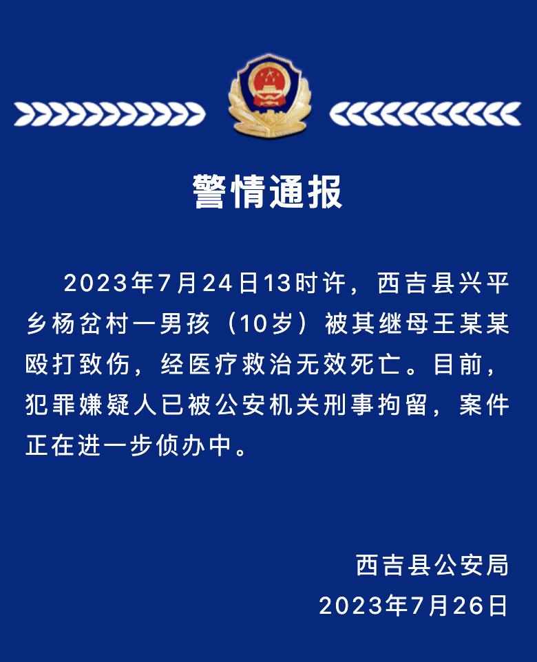 新京报讯 据西吉公安官微消息,2023年7月24日13时许,西吉县兴平乡杨岔村一男孩(10岁)被其继母王某某殴打致伤,经医疗救治无效死亡。目前,犯罪嫌疑人已被公安机关刑事拘留,案件正在进一步侦办中。