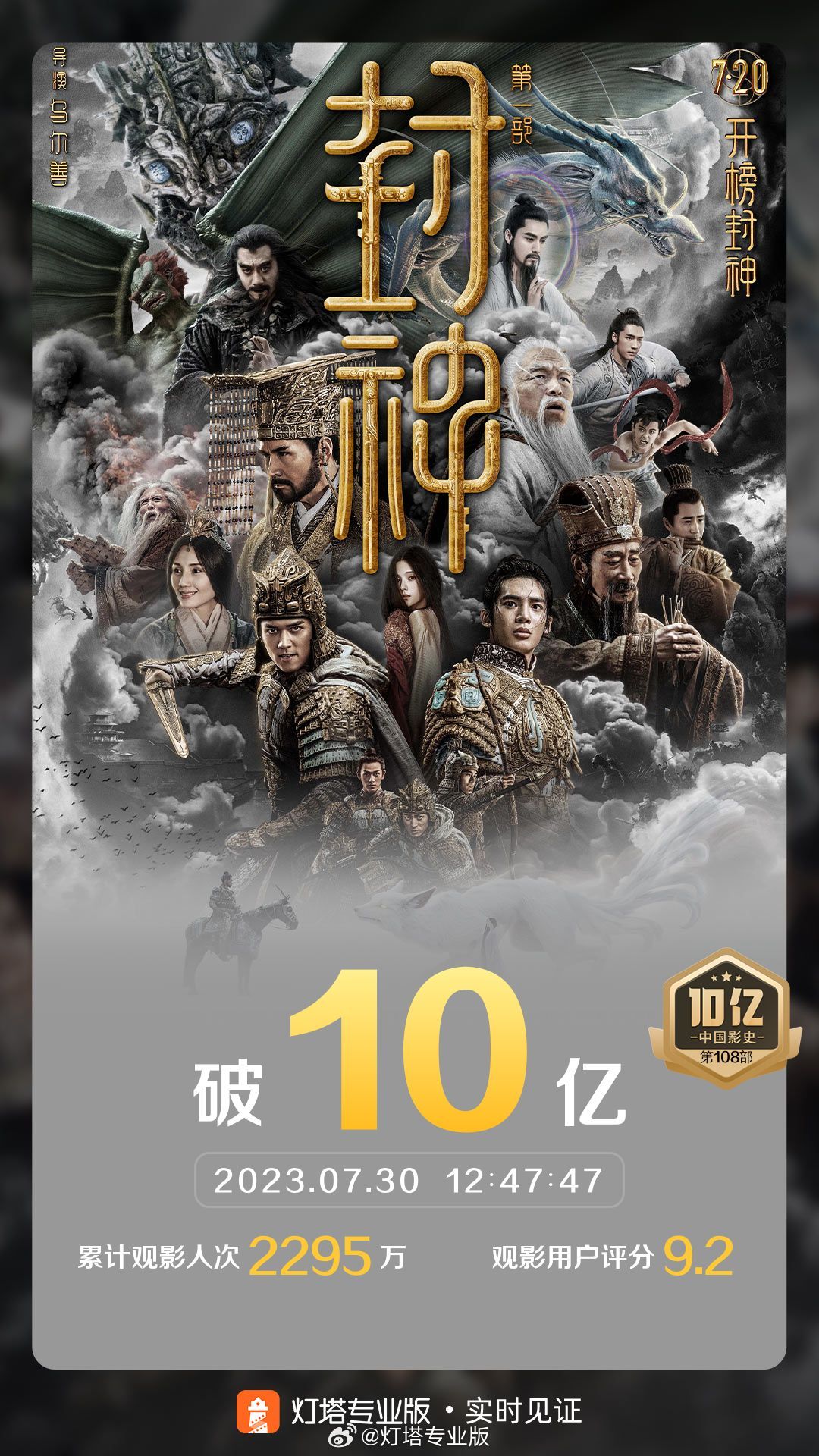 新京报讯 据灯塔专业版实时数据显示,截至7月30日12时47分,电影《封神第一部》上映11天,票房突破10亿。影片由乌尔善执导,费翔、李雪健、黄渤、于适、陈牧驰、娜然、此沙、武亚凡、夏雨、袁泉、王洛勇、侯雯元、黄曦彦、李昀锐、杨玏、陈坤出演,于7月20日正式上映。