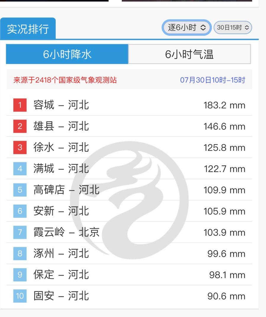 全国降雨量排行榜被河北、北京“占领”