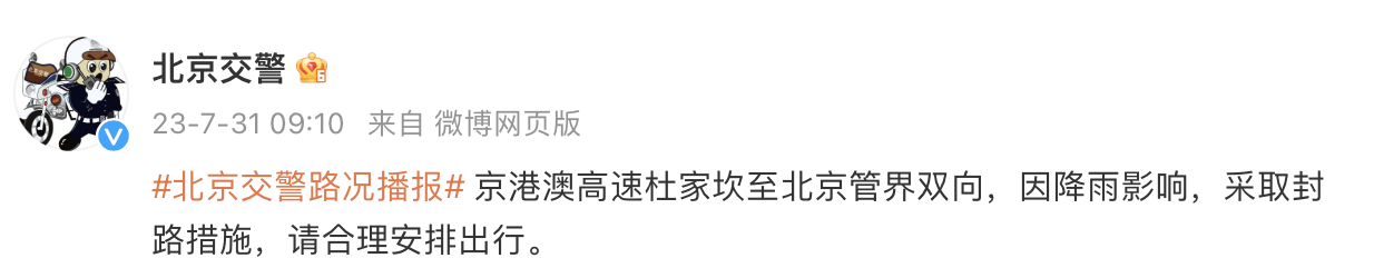 新京报讯 据@北京交警 消息,京港澳高速杜家坎至北京管界双向,因降雨影响,采取封路措施,请合理安排出行。