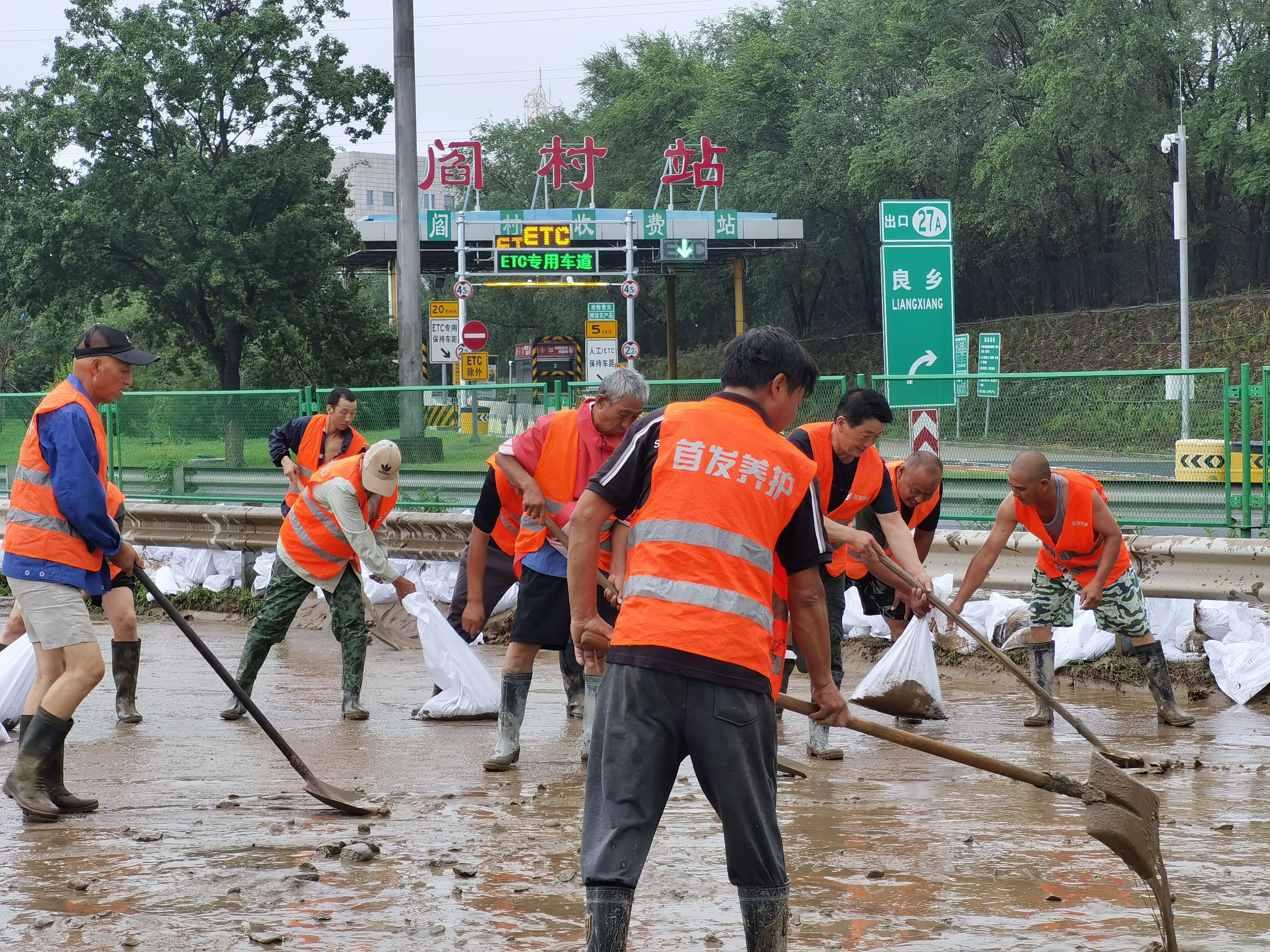 新京报讯(记者裴剑飞)今天下午一点,记者在京港澳高速阎村段看到,由于降雨导致周边积水倒灌,这一位于铁路桥下的下洼路段内积水严重,现场百余名抢险人员正在进行紧张的抢险作业。