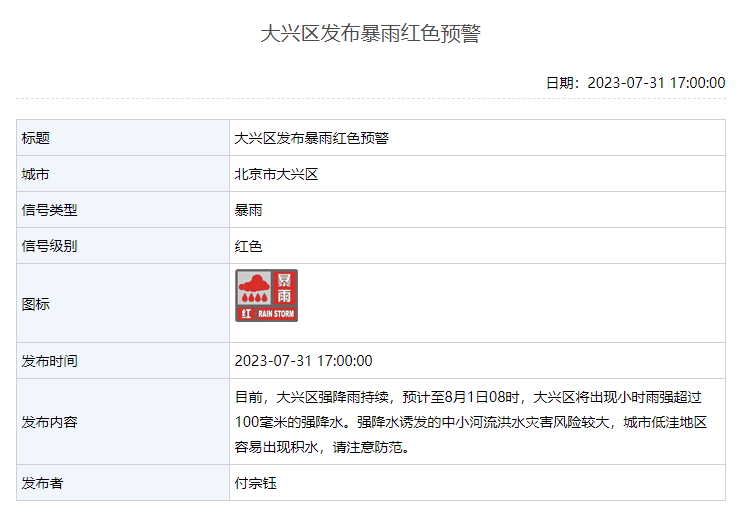 北京市大兴区发布暴雨红色预警