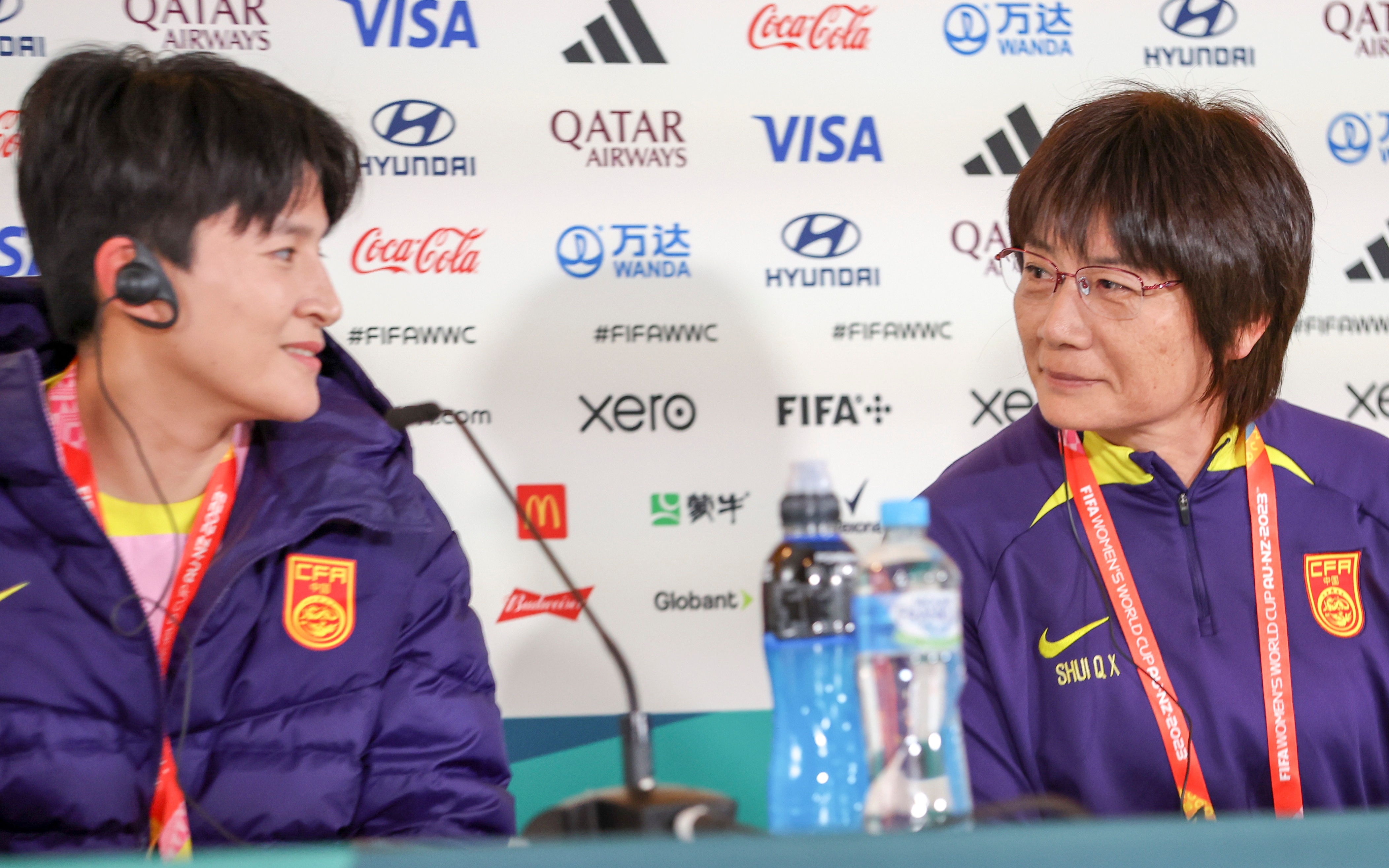 中国女足队长王珊珊(左)和主帅水庆霞出席赛前发布会。 图/新华社