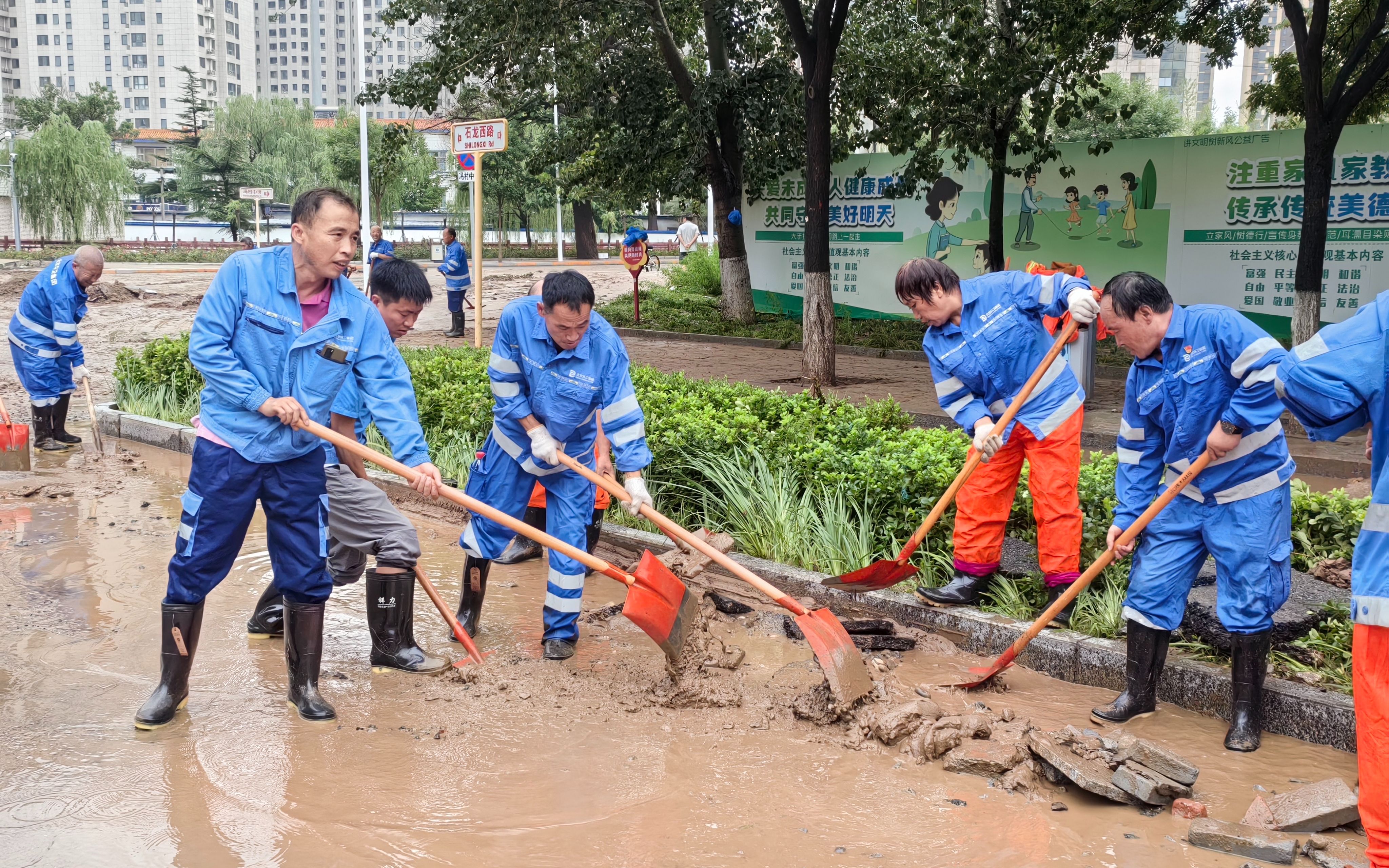 工作人员在用铁锹清理路面淤泥。北京环卫集团供图