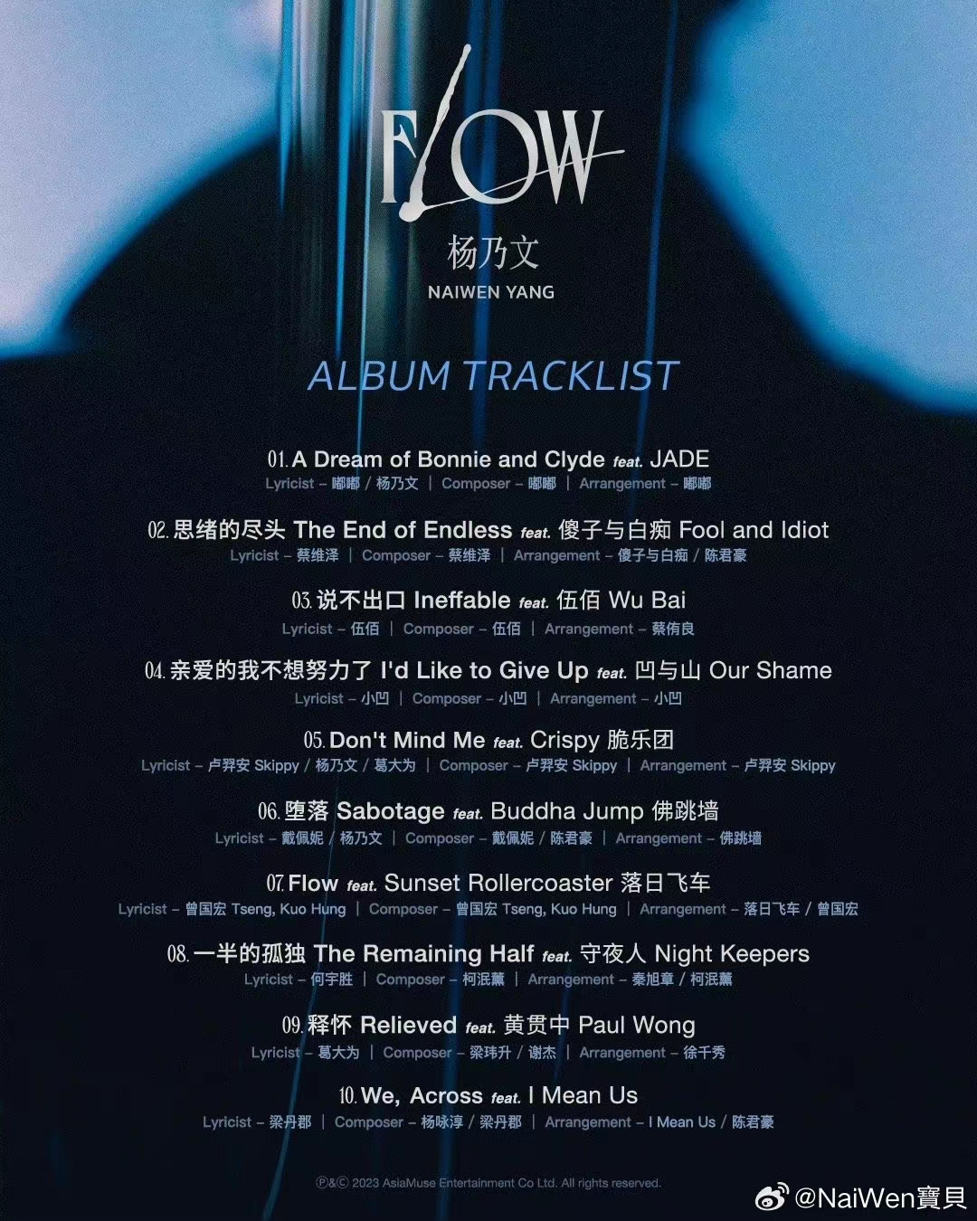 新京报讯 8月1日,杨乃文公布新专辑《Flow》曲目及合作阵容。专辑收录10首歌曲,合作众多歌手和热门乐队,专辑将于8月25日正式发行。