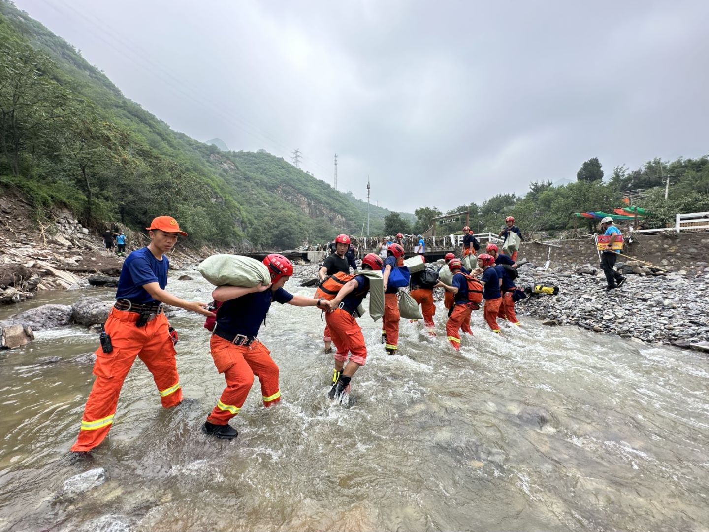 消防救援人员带着救援物资乘车沿着妙峰山路上山,很快就被一处塌方路段挡住,车辆无法通行,于是消防救援人员扛着救援物资徒步前行。行进过程中,消防救援人员先后涉险爬过70度陡坡的石壁,3次蹚水穿过满是大石块的河滩,多次经过塌方路段,最终来到桃园村。