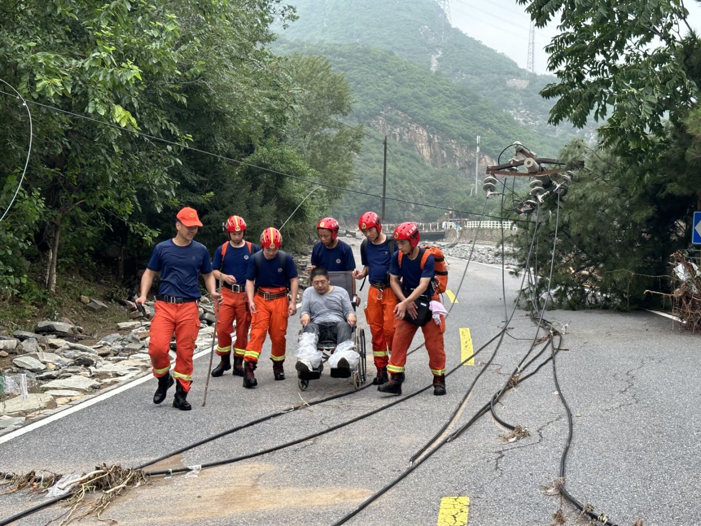 到达涧沟村时,消防救援人员得知一名病人需要做透析的消息后,大兴消防支队副支队长李文斌考虑到病人行走不便,且道路难行的因素,带领救援人员借来一辆手推车,让病人坐在推车里,消防员推着前行。经过近5个小时的不懈努力,当天20时左右,病人被安全转运下山,由医护人员送往医院进行救治。