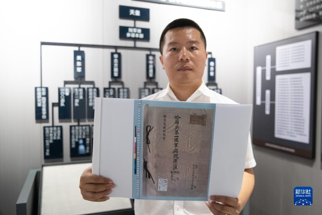 8月5日,在黑龙江省牡丹江市举办的侵华日军细菌战罪证陈列展上,研究人员展示《日军哈尔滨第一陆军病院原簿》(影印件)。新华社记者 张涛 摄