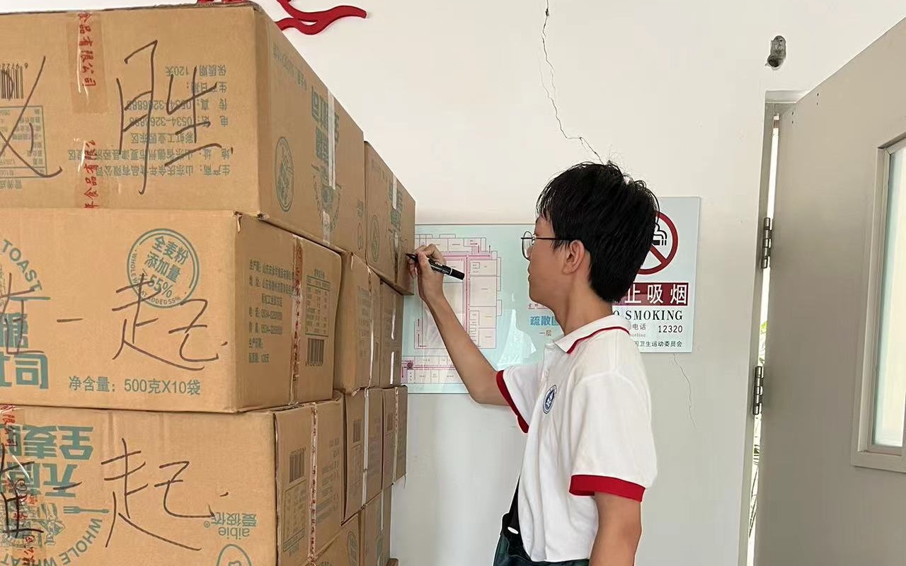 “我在学校还看到了我们班的同学,我们一起写祝福语。”王子文告诉记者,拿起笔写下这些温暖的文字时,自己对“一方有难,八方支援”有了更多的感悟。一直在搬箱子的杜泽铠同样累并快乐着,“初三毕业之后我还没有回过学校,线上跟老师聊微信倒是很多,老师也十分关心我们,下雨的时候就在群里提醒大家别乱跑。”谈及这次在学校帮忙打包物资的经历,杜泽铠表示,自己并没有想太多,当时就想着回来帮忙,“在学校三年的时间,我们也一直在向雷锋学习,学习助人为乐、无私奉献的可贵,我觉得我们都要践行这种精神。”