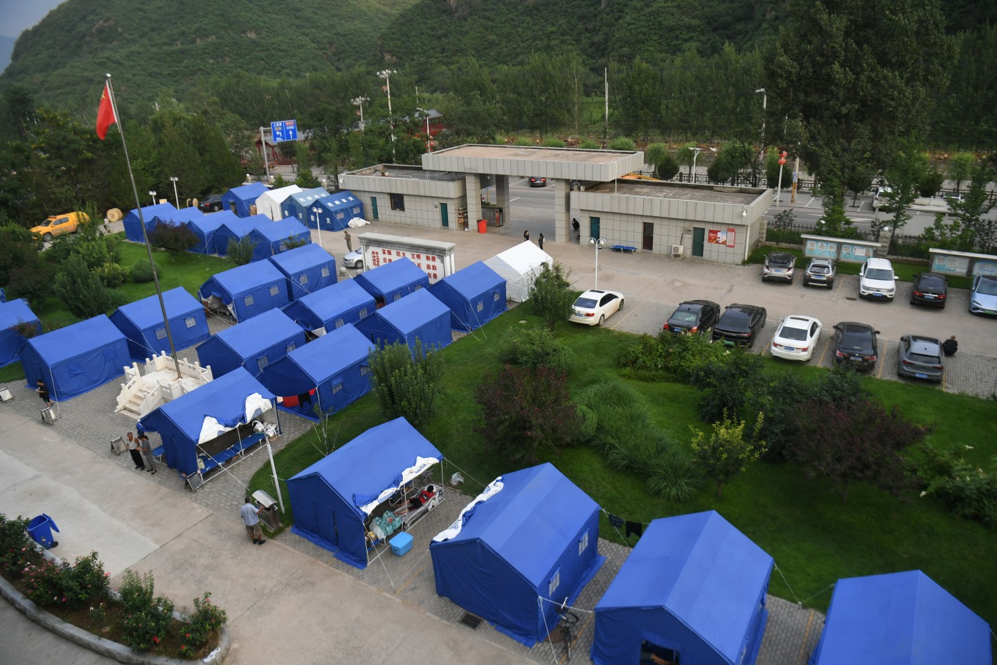 村里的老人被安置在政府大楼里,小伙子们冒着雨,连夜搭帐篷,工区里的几十个年轻人成了主力。
