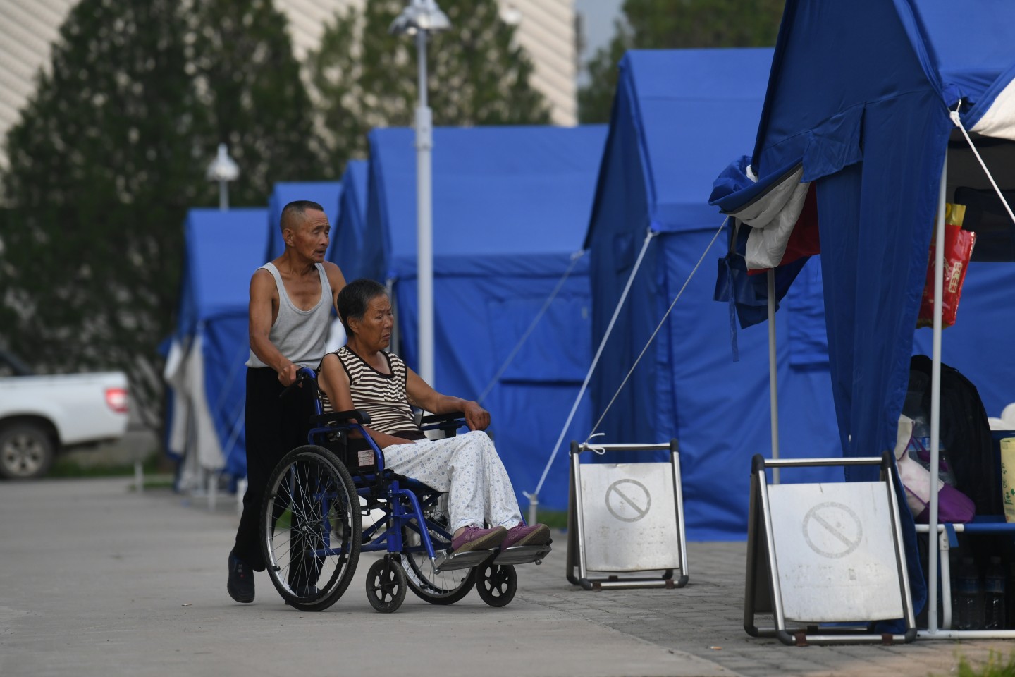 在安置点里,连维茂推着妻子散步。新京报记者 王颖 摄