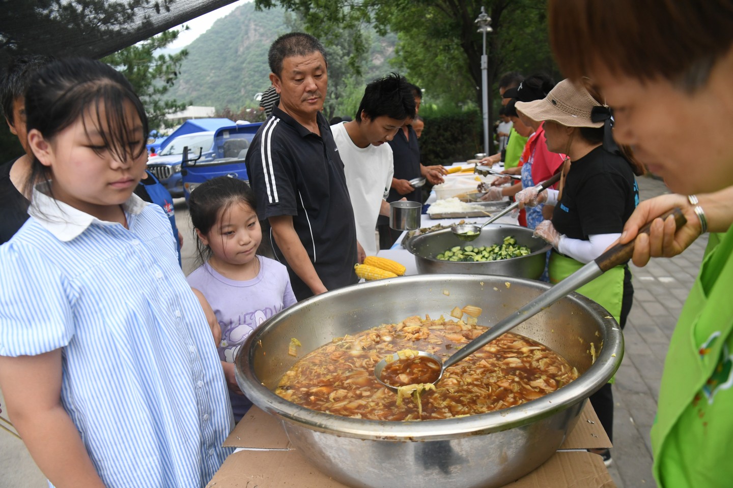 村民排队打饭。新京报记者 王颖 摄